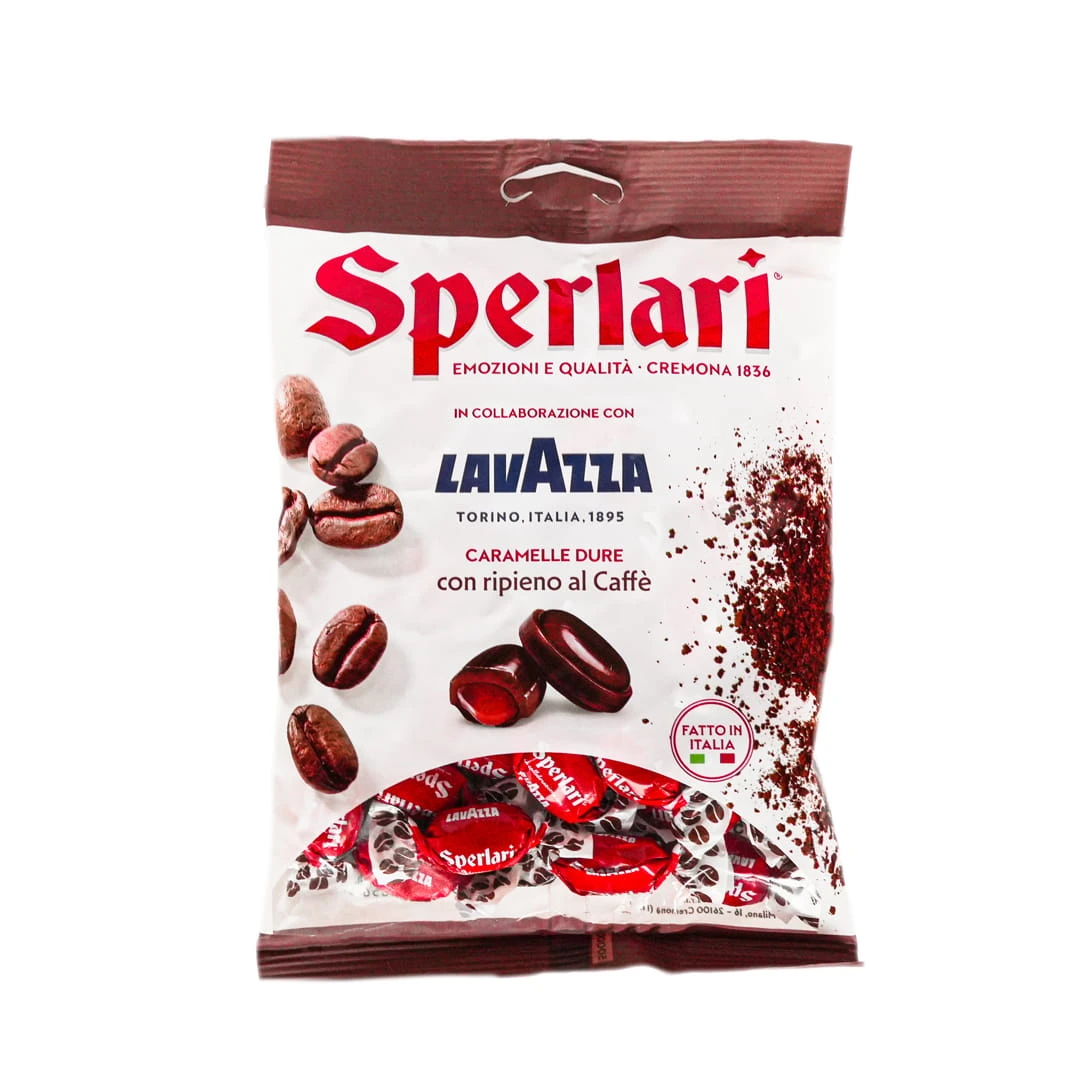 Cukierki Sperlari Lavazza 175 g to włoskie, kawowe karmelki o kremowym, aksamitnym wnętrzu i intensywnym aromacie espresso, idealne dla miłośników klasycznego smaku Lavazzy w słodkiej formie.