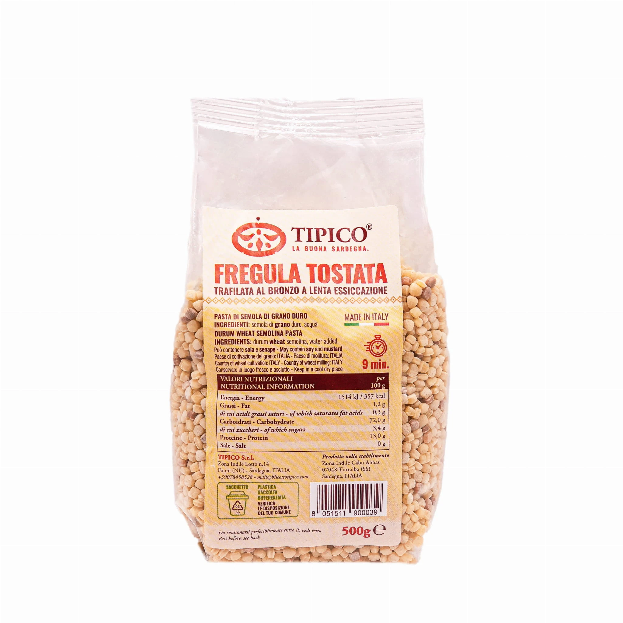 Makaron fregula tostata Tipico to tradycyjny włoski makaron z Sardynii w formie drobnych, prażonych kuleczek o lekko orzechowym smaku. Wytwarzany z semoliny z pszenicy durum, wyróżnia się charakterystyczną strukturą i aromatem. Doskonale sprawdza się w daniach z owocami morza, warzywami i sosami. To wyjątkowy składnik kuchni śródziemnomorskiej.