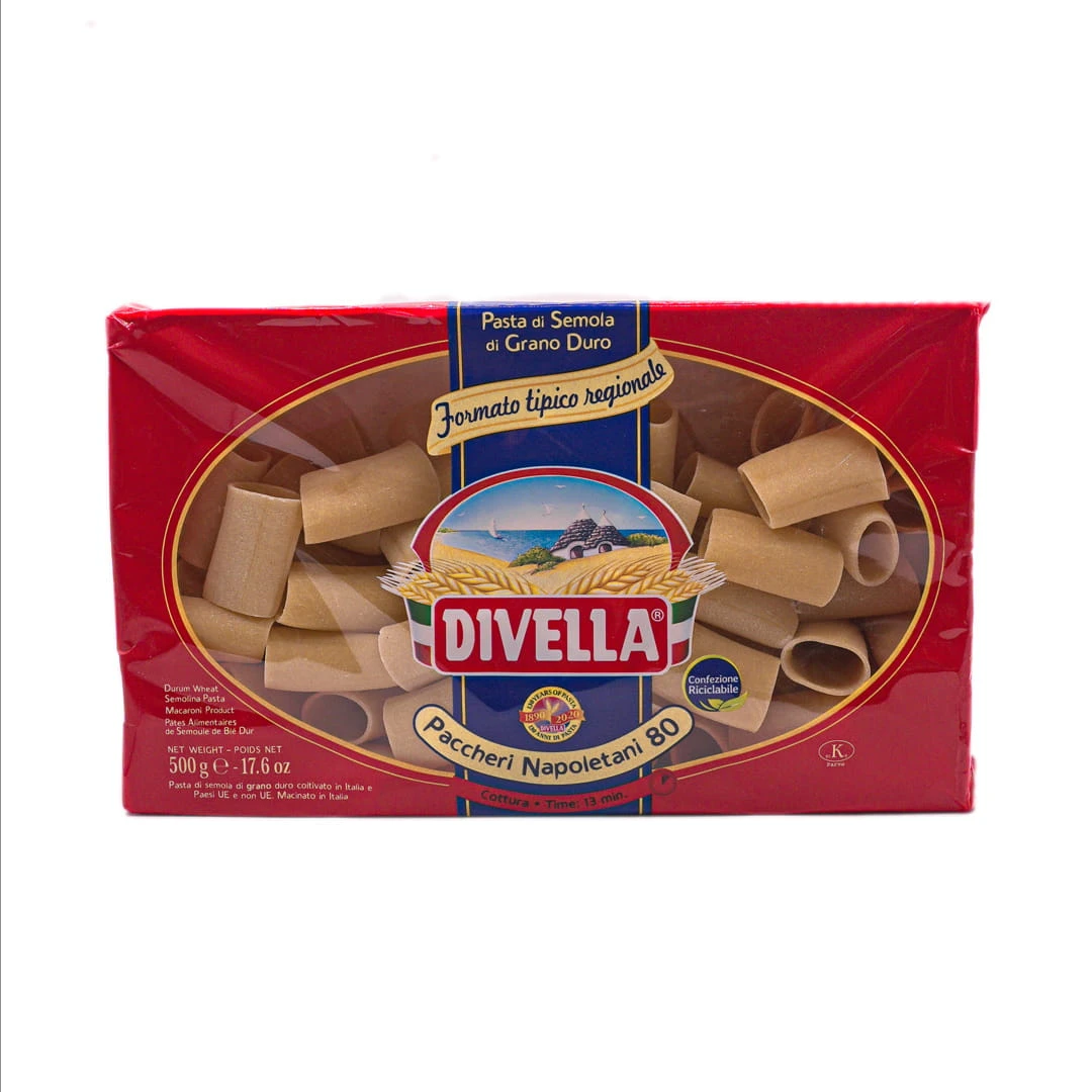 Paccheri Napoletani Divella 500 g to tradycyjny makaron z regionu Kampanii, o charakterystycznym kształcie dużych, szerokich rurek. Idealny do faszerowania, zapiekania i podawania z gęstymi sosami – prawdziwa klasyka neapolitańskiej kuchni.