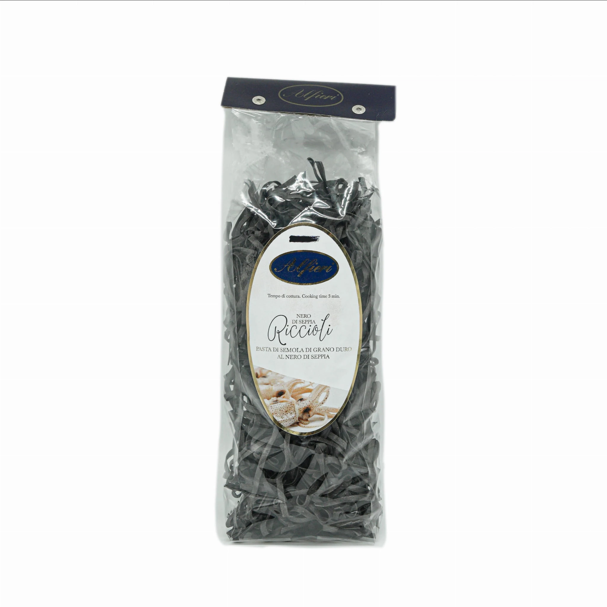 Makaron Riccioli z sepią 250 g to wyjątkowy produkt o delikatnym morskim aromacie i eleganckim, ciemnym kolorze nadanym przez sepię. Jego zakręcona forma świetnie otula sosy, tworząc pełne smaku dania. Idealny do owoców morza i lekkich sosów na bazie oliwy. Doskonała baza do wytwornych dań kuchni śródziemnomorskiej.