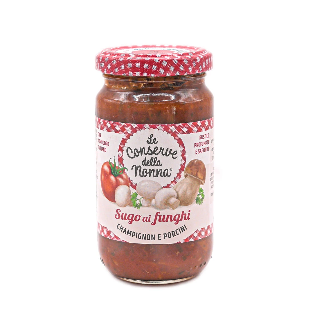 Sos grzybowy Conserve della Nonna 190 g to aromatyczny włoski sos pomidorowy z dodatkiem grzybów i przypraw. Idealny do makaronu, risotto, zapiekanek i mięs – naturalny smak tradycji bez sztucznych dodatków.