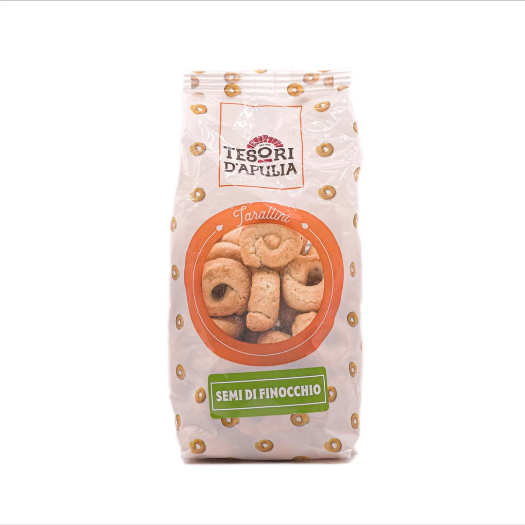 Tradycyjne włoskie krążki taralli z dodatkiem aromatycznych nasion kopru włoskiego, chrupiące i pełne śródziemnomorskiej autentyczności. Idealne jako przekąska solo lub z lampką wina.